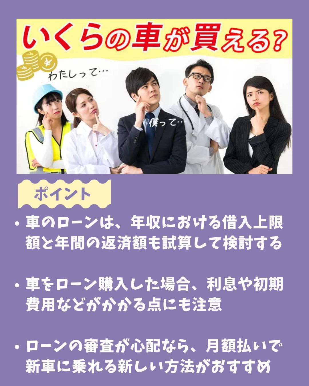 〇車をローン購入した場合、利息や初期費用などがかかる点にも注意