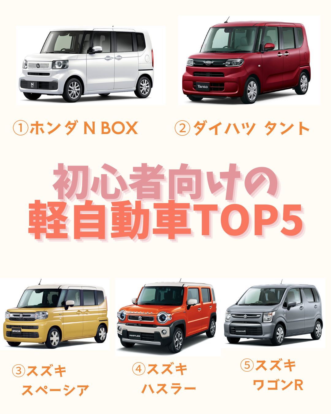 初心者向けの軽自動車ランキング1位のホンダ NBOXは広い室内と安定した走りに定評がある、大人気の軽スーパーハイトワゴン。2位のダイハツタントは「ミラクルオープンドア」が実現する乗降性の良さが魅力。ファミリーに大人気の軽スーパーハイトワゴン。3位のスズキスペーシアはより便利に、快適に!広い室内を活かす工夫が満載の軽スーパーハイトワゴン。4位のスズキハスラーは愛嬌のあるユニークなデザインに確かな走破性を備えた実力派軽SUV。5位のスズキワゴンRはマイルドハイブリッドを採用、低燃費と使い勝手の良さに定評のある軽ハイトワゴンの定番モデル。