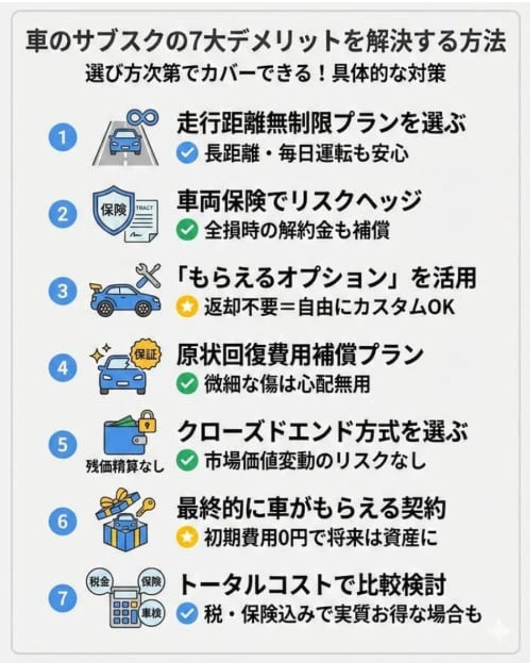 車のサブスクは、お得なイメージがありながらも利用には不安を感じる方も少なくありません。一般的に車のサブスクにおいてデメリットといわれることも、そのほとんどはサービスやプランの選び方次第でカバーができます。デメリットに対処しつつ、自身の状況に合う車のサブスク選びができれば、購入するよりもお得に車に乗り続けられます。カルモくんでは、すべての車種を対象に7年以上の契約ならば走行距離が無制限に。7年以上の契約で車をもらう選択ができ、契約満了時に乗っていた車を自分のものにすることができるのでカスタマイズやドレスアップなどできます。気軽に大曲タイヤへご相談ください。