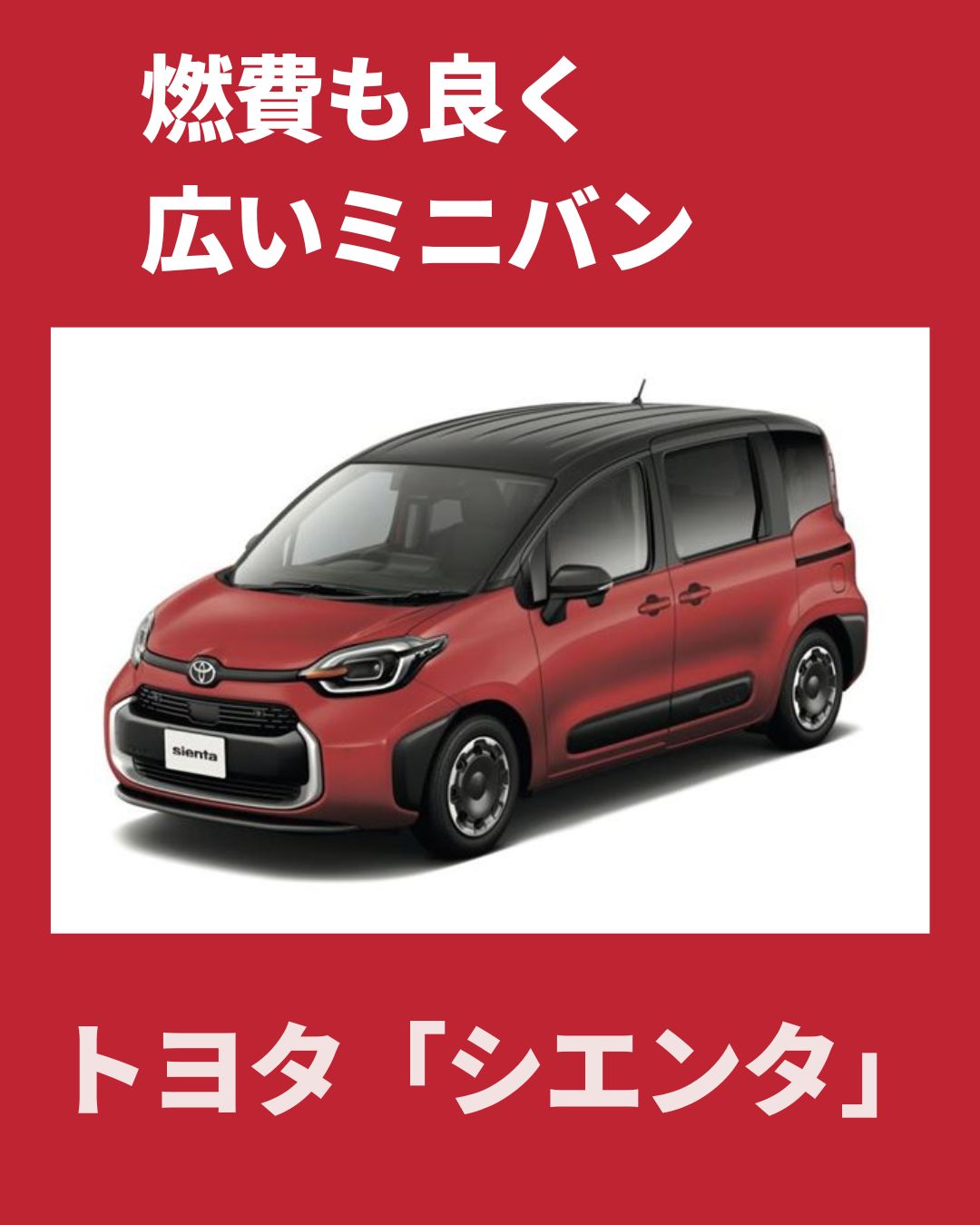 便利なコンパクト・ミニバン「シエンタ」は燃費性能が高く、室内空間も広いため、ファミリー層に人気です。シエンタの乗車人数は、5人乗り(2列シート)と7人乗り(3列シート)の2種類があり、グレードによって選べ、用途に合わせて大容量の荷室や大人数乗車が可能です。ボディサイズが大きすぎず丁度いいですね。