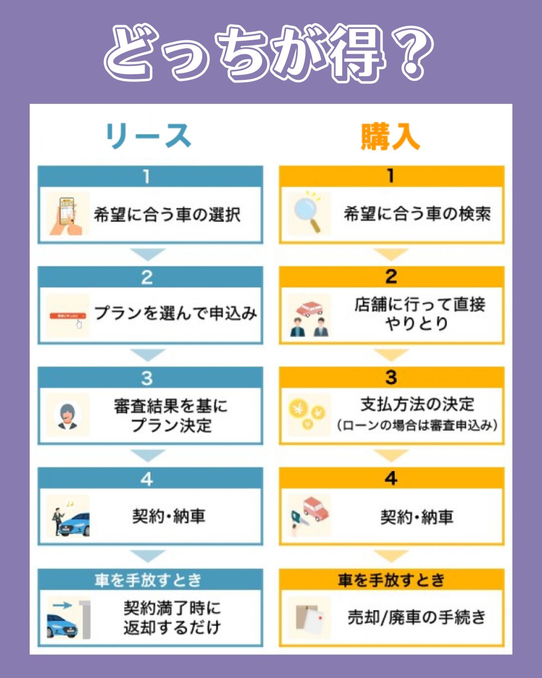 車を手に入れる方法には、大きく分けてリースと購入の2つがあります。リースと購入どちらが得かは、車にかけられる予算や車の用途など、各自が重視するポイントによるので、一概には決められません。車を持つ手続きだけでも、図のような違いがあります。