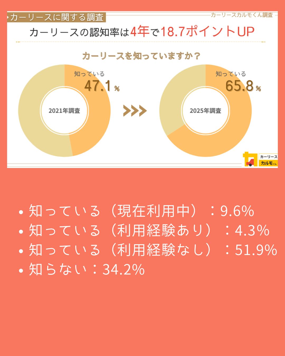 昨今はカーリースのサービス多様化や明朗化が進み、コストを抑えながら、所有車と変わらない使い方ができるプランも増えています。しかし今回の調査からは、認知は広がっている一方で、サービス内容の正しい理解が十分に浸透していない状況が浮き彫りとなりました。